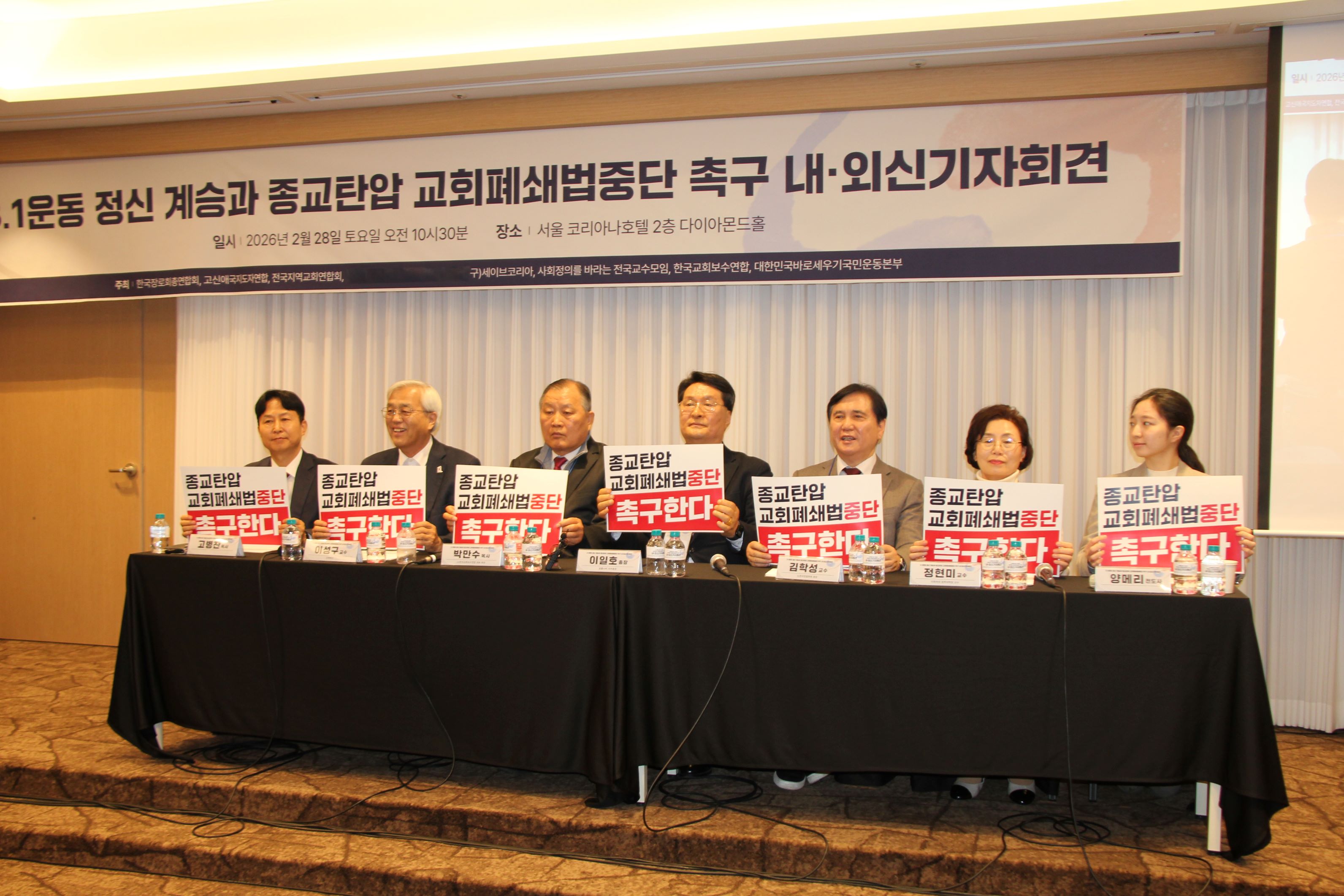 ¡ãÇöÁ¤ºÎ Á¾±³ÅºÇÕ Áß´ÜÃ˱¸ ±¹³»,¿Ü ±âÀÚȸ°ß(»çÁø=±è¼®¼è ±âÀÚ) Çѱ¹µðÁöÅдº½º ±è¼®¼è ±âÀÚ¤Ó¼¿ïÄÚ¸®¾Æ³ªÈ£ÅÚ 2Ãþ ´ÙÀ̾ƸóµåȦ¿¡¼ Áö³2¿ù 28ÀÏ Çѱ¹Àå·Î±³ÃÑ¿¬ÇÕȸ, (»ç)Çѱ¹±³È¸º¸¼ö¿¬ÇÕ, (±¸)¼¼À̺êÄÚ¸®¾Æ, ¼£·Ò³ªºñ, °í½Å¾Ö±¹ÁöµµÀÚ¿¬ÇÕ, Àü±¹Áö¿ª±³È¸¿¬ÇÕ, »çȸÁ¤ÀǸ¦¹Ù¶ó´ÂÀü±¹±³¼ö¿¬ÇÕ, ´ëÇѹα¹¹Ù·Î¼¼¿ì±â±¹¹Î¿îµ¿º»ºÎ µî Çѱ¹±³È¸¸¦ ´ëÇ¥ÇØ¿Â ±âµ¶±³Á¾±³´Üü¿Í ½Ã¹Î´Üü ¹× ½ÅÇб³¼ö, Çå¹ý±³¼ö µîÀÌ ÇÑÀÚ¸®·Î ¹¶ÃÄ ÀÌÀç¸í Çö ´ëÅë·ÉÀÌ ¡®Á¾±³ÀÇ Á¤Ä¡ Âü¿©¡¯ ¹ß¾ð ÈÄ ¹ÎÁÖ´ç ¼Ò¼Ó ±¹È¸ÀÇ¿øµéÀÇ ¹ßÀÇ·Î ÁøÇà ÁßÀÎ ¡®Á¾±³Åº¾Ð°ú ±³È¸ Æó¼â¹ý ´ëÇÑ Áß´Ü Ã˱¸¡¯¸¦ À§ÇÑ ±âÀÚȸ°ß°ú 3.1¿îµ¿ Á¤½Å °è½ÂÀ» À§ÇÑ ¼º¸í¼ ¹ßÇ¥°³ÃÖÇß´Ù.